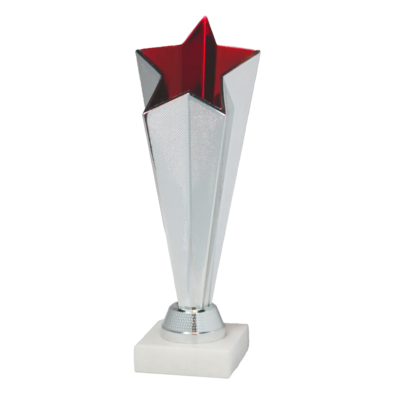 Premiază performanța cu această cupă elegantă argintiu/roșu, perfectă pentru evenimente sportive, concursuri școlare