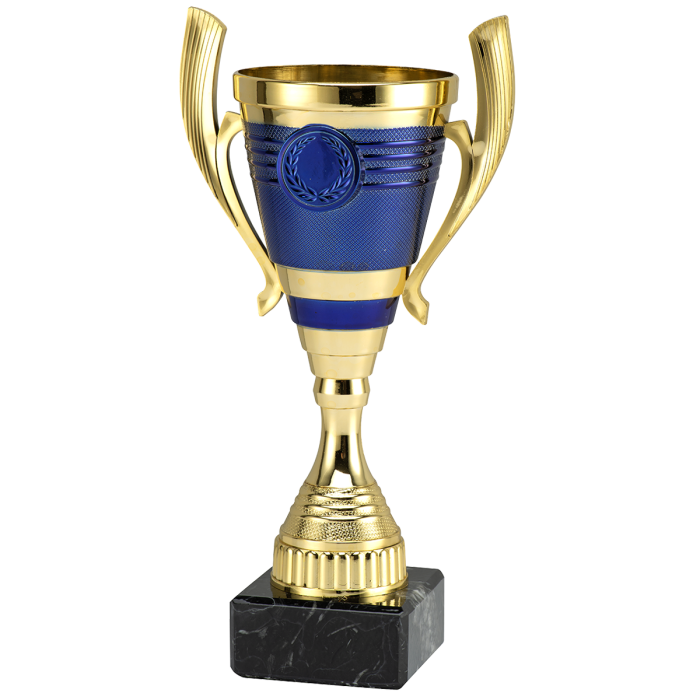 Cupă elegantă pentru premiere, realizată din plastic cu finisaj auriu și albastru, montată pe bază solidă din marmură neagră.
