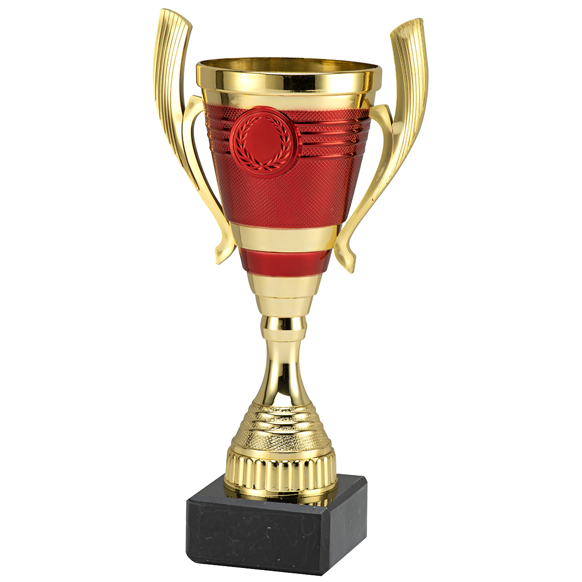 Cupă elegantă pentru premiere, realizată din plastic cu finisaj auriu și roșu, montată pe bază solidă din marmură neagră.